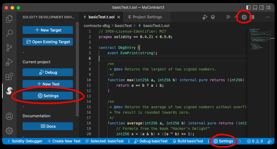 The settings window is a graphical frontend for dbg.project.json and dbg.contract.json. It lets you configure the behaviors of the Solidity compiler and debugger.