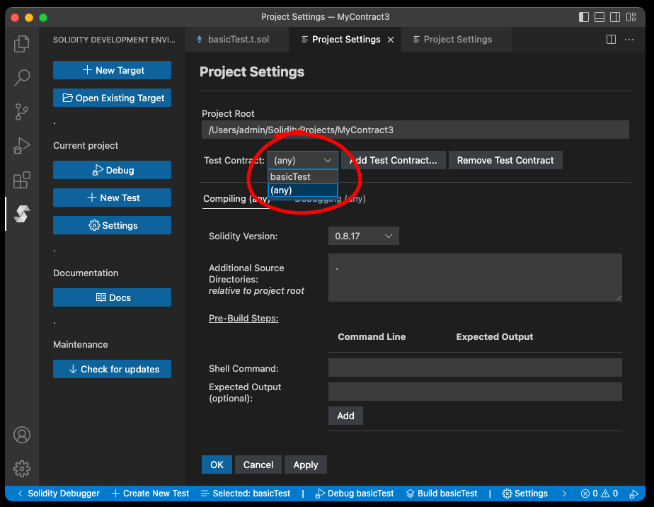 | Pre-Build Steps | Shell commands to run before compiling the test contract |