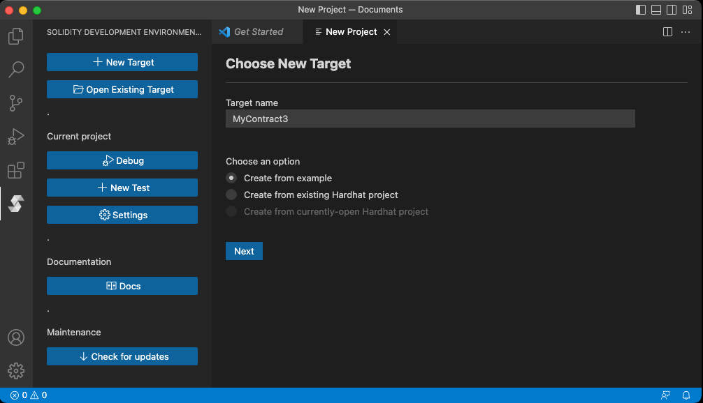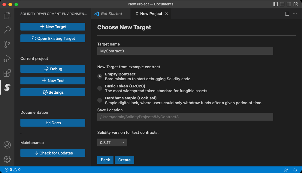 Click the New Target button. A menu will appear that will allow you to create a new debug target. Type a name for your debug target, or just leave the default name provided. In the screenshots below, the default name is "MyContract3".