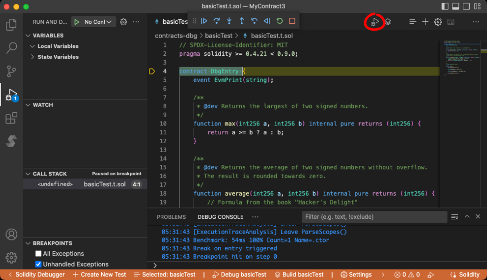 Execution will begin and automatically break on line 4 where the test contract begins. This behavior is called Break-on-Entry. You can disable Break-on-Entry in the Project Settings window. You can now step through the execution of the contract.