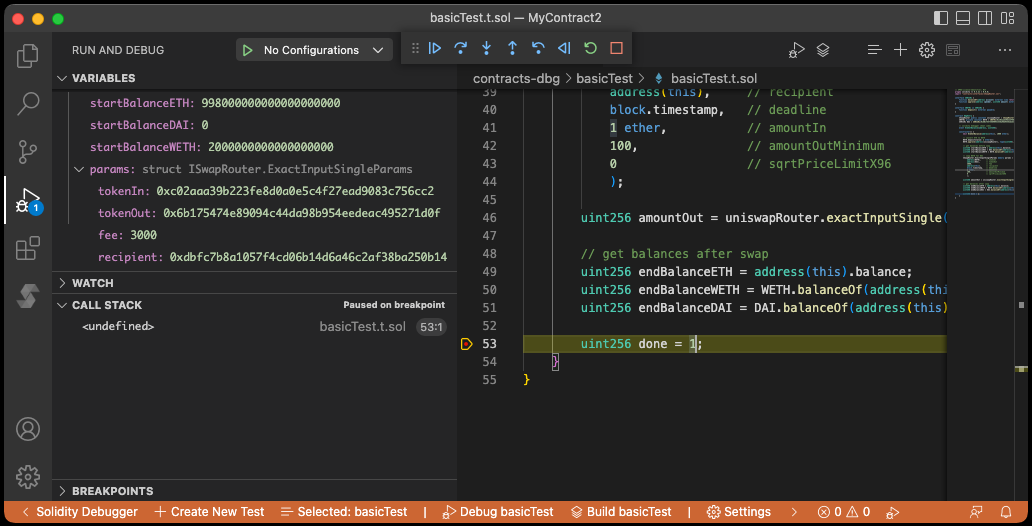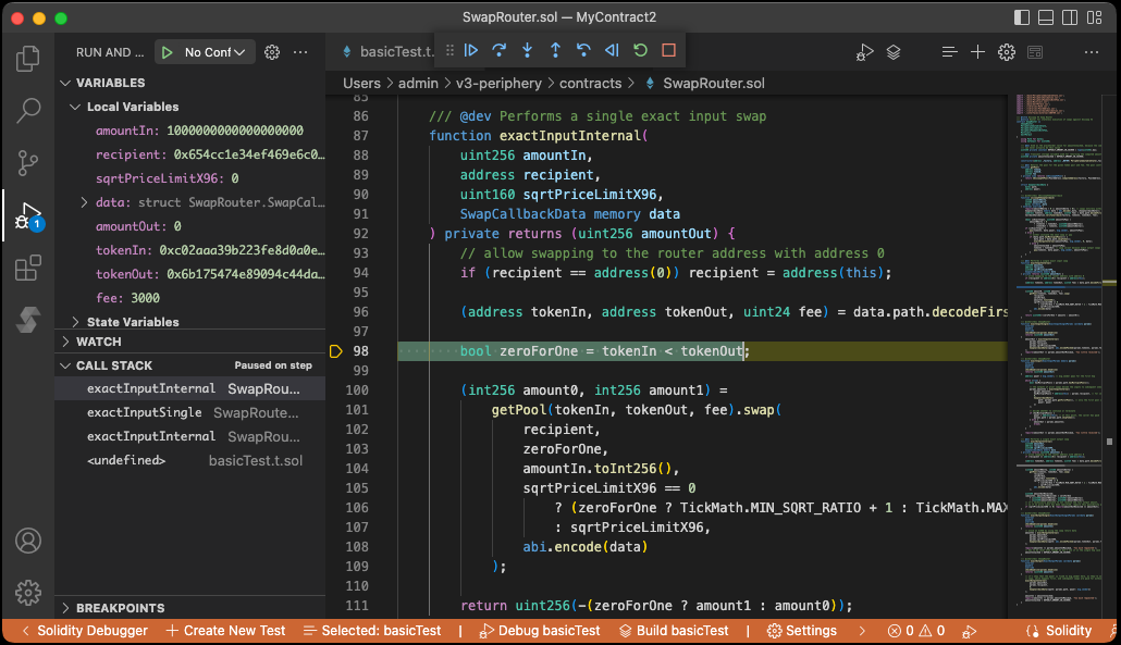 In order to be able to step into the Uniswap code, we need to compile its contracts and generate an artifacts folder. The Solidity Debuger reads necessary metadata from these artifacts that helps it match deployed bytecode to source code. Run: